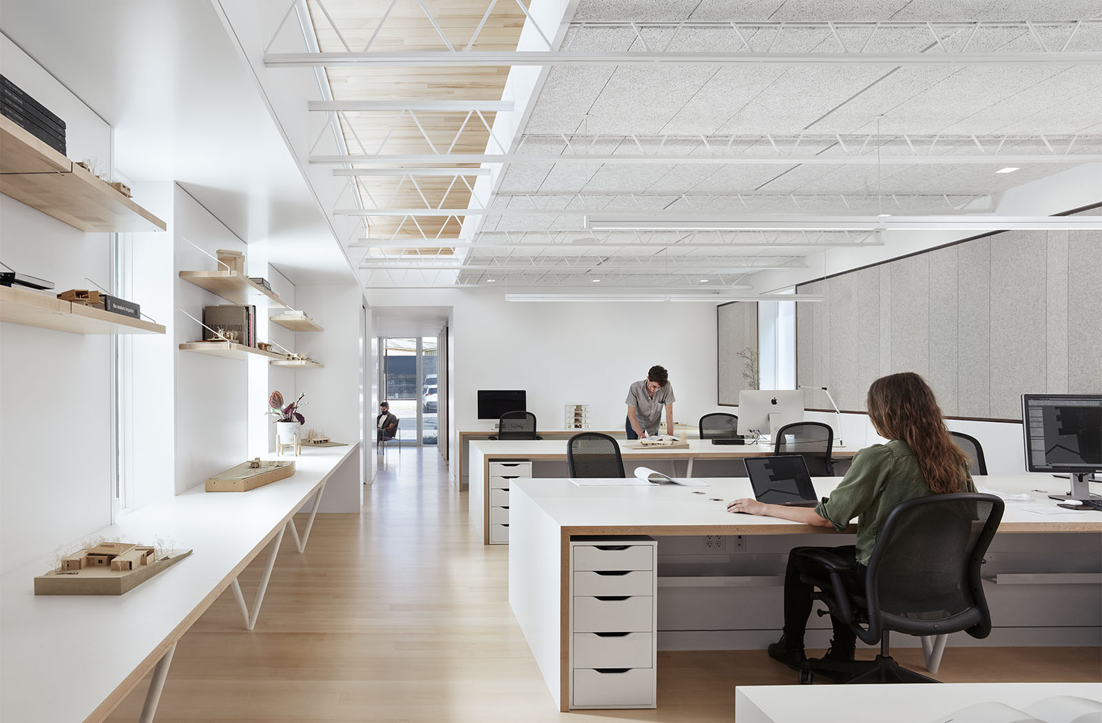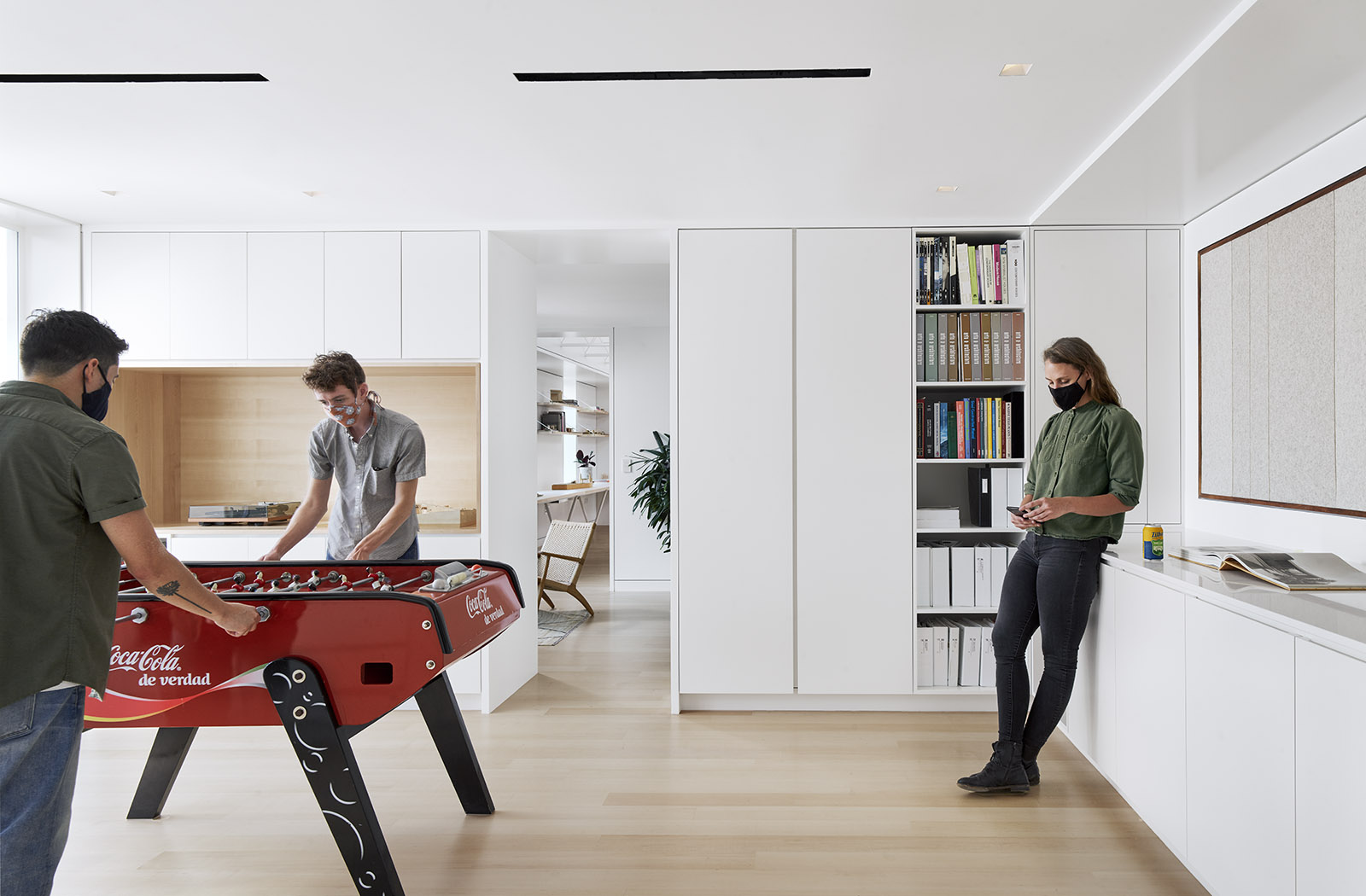 We worked with a nuanced white plaster exterior but retained the distinctive shadow-block where possible. The interior design breaks down into small, residential nests. Working in the depths of pre-vaccine COVID 19, we delivered the project design-build, capitalizing on the talent embedded in Austin’s construction community.