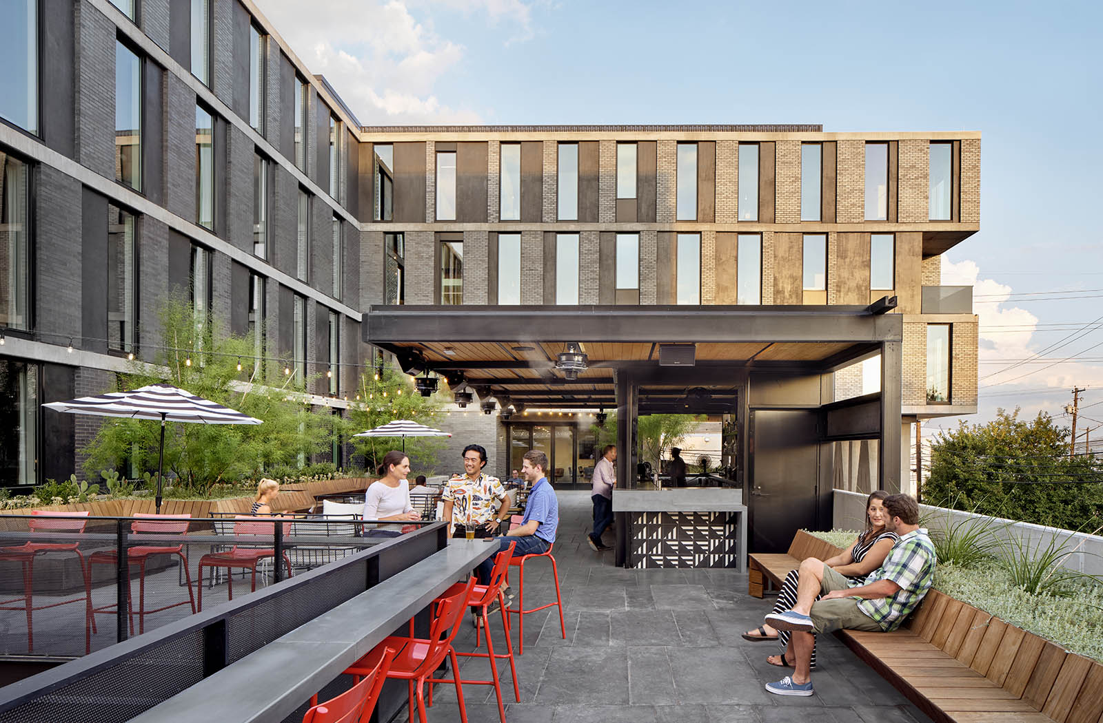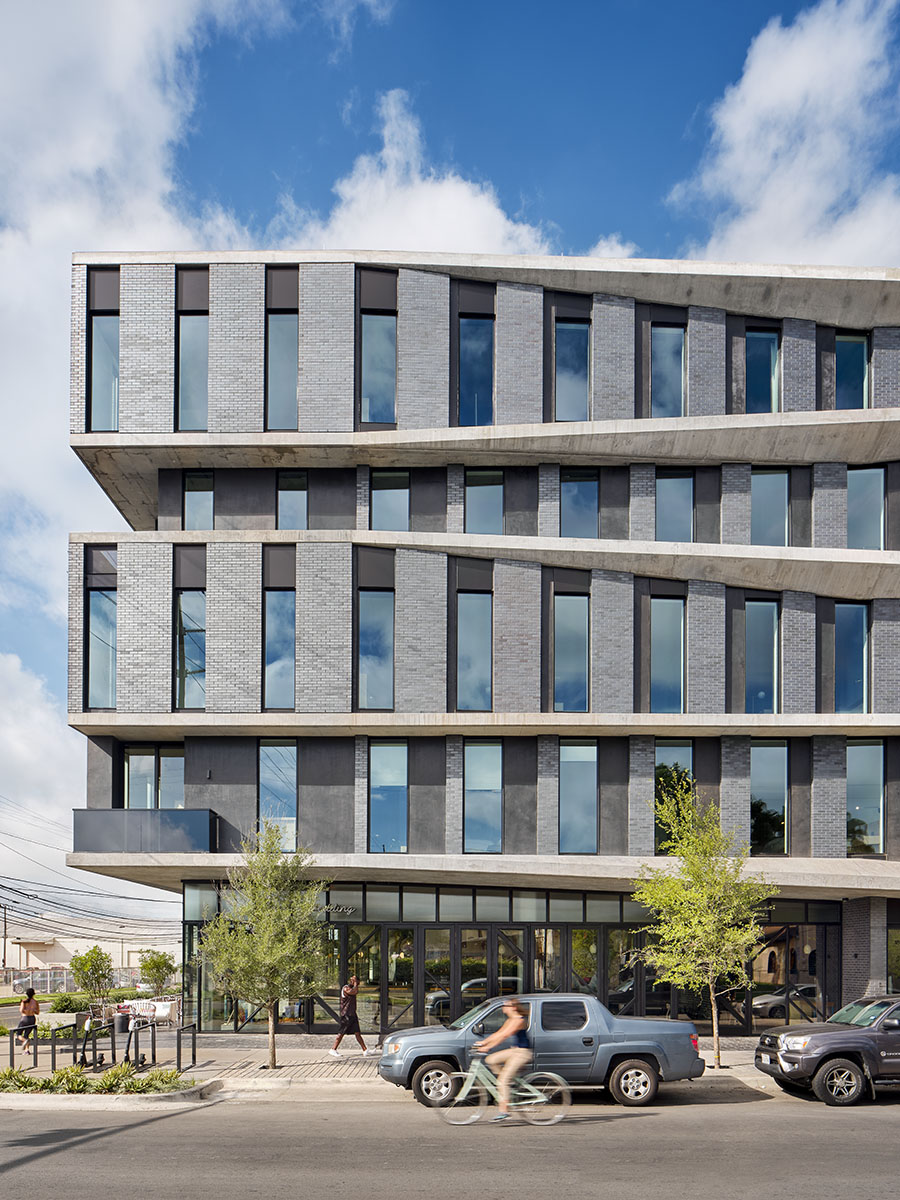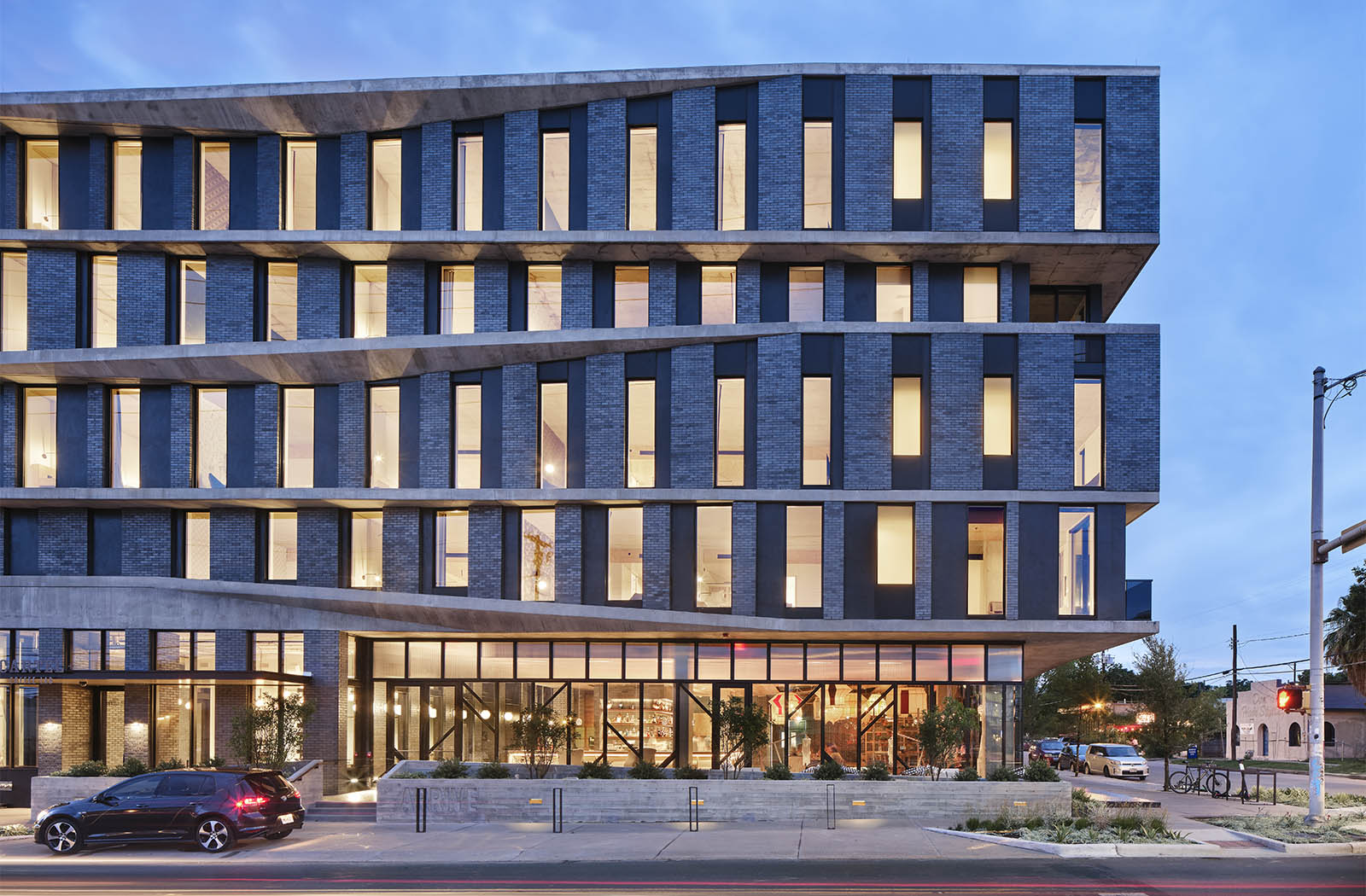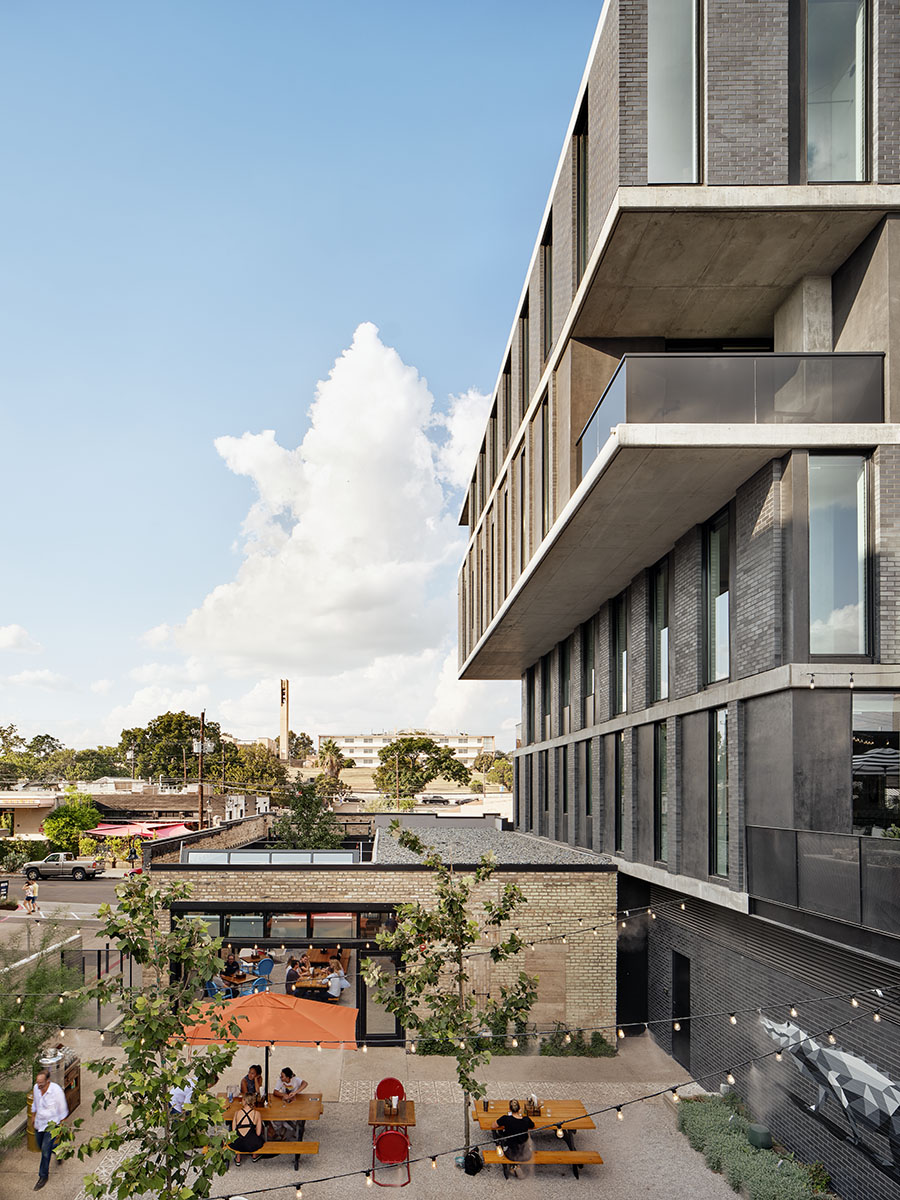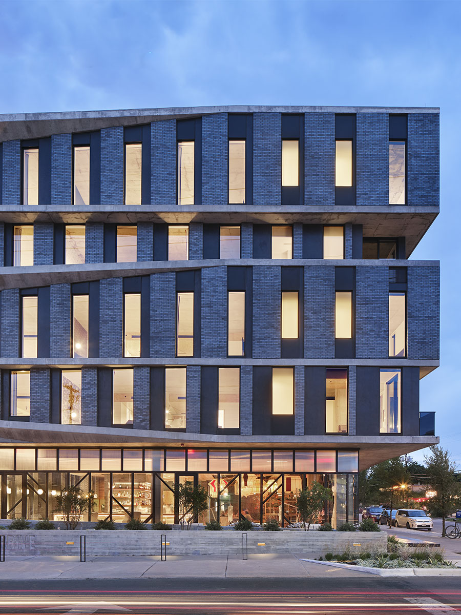 The undulating façade serves as a dynamic response to one of the more form-directive requirements of Austin’s street-side guidelines, which requires a 20-foot x 2-foot notch to simulate brownstone articulation – in the drafters’ heads this would enhance walkability and scale. Baldridge turned this on its head, achieving the articulation by scissoring the plates, which in turn created balconies and covered porches for hotel occupants.
