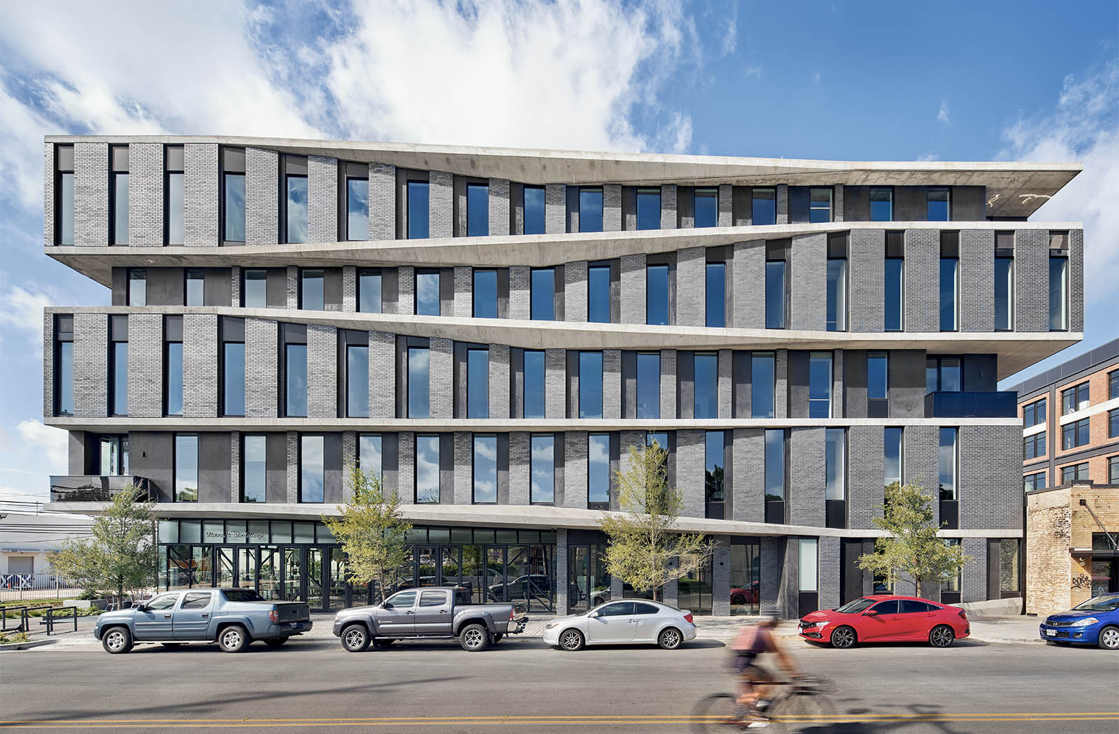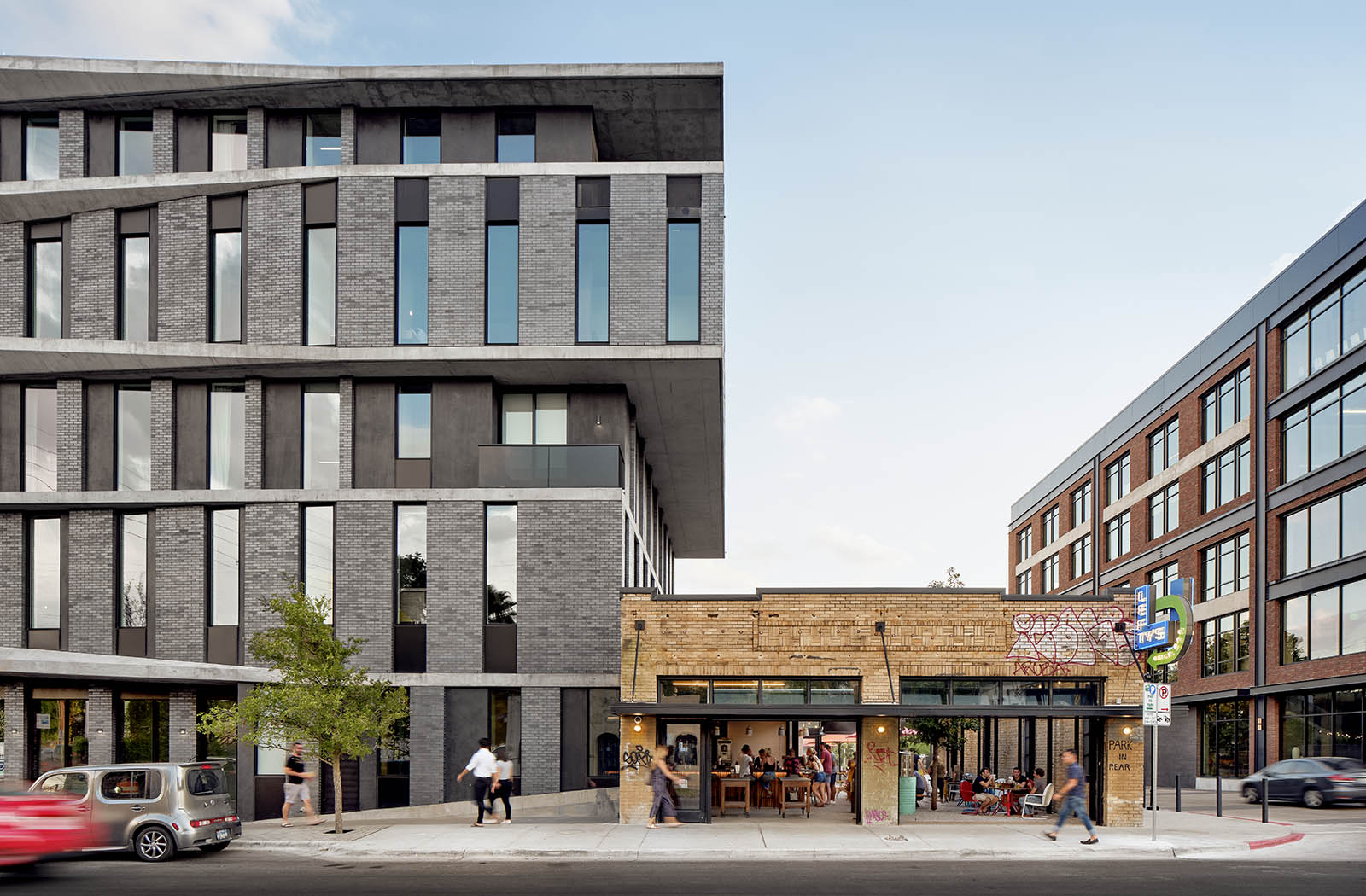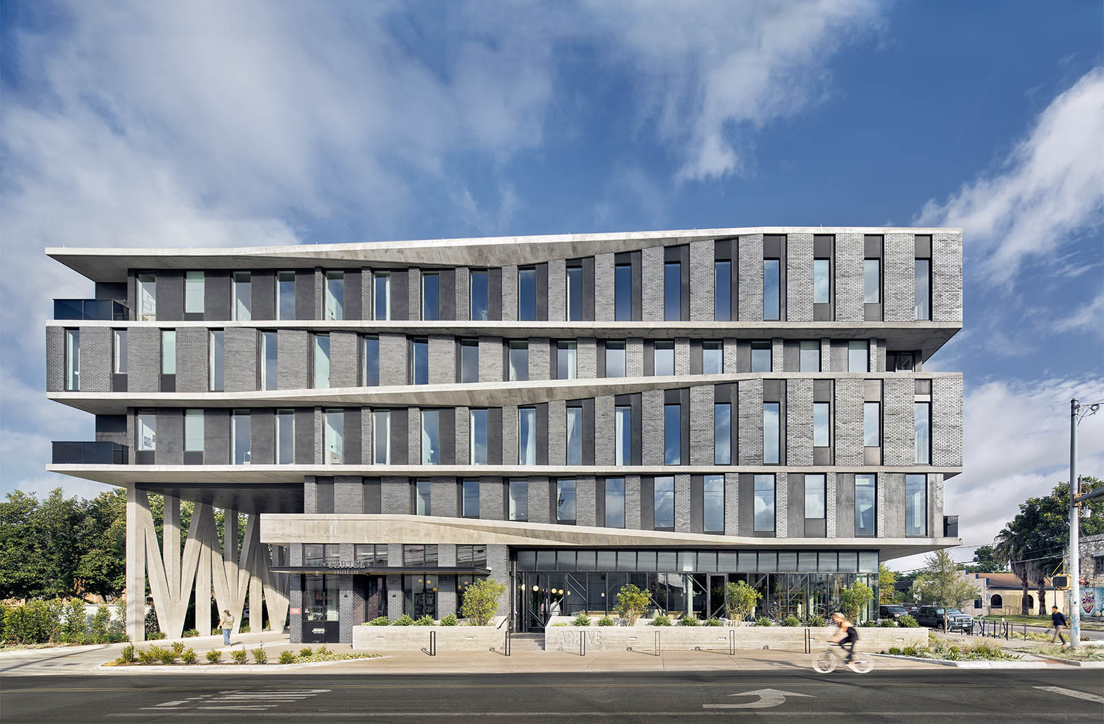 The Arrive Hotel comprises eighty-three rooms and a multi-use podium, housing two restaurants, three bars, a coffee shop, leasable street-side retail space and parking. The owners commissioned Baldridge to question established anti-public hotel tropes – the grand entry, the sad hotel restaurant, the always-empty lobby. They preferred to minimize the hotel identity instead. While it is a statement structure with a design that swings for the fences, the street-level restaurants claim the pedestrian identity.