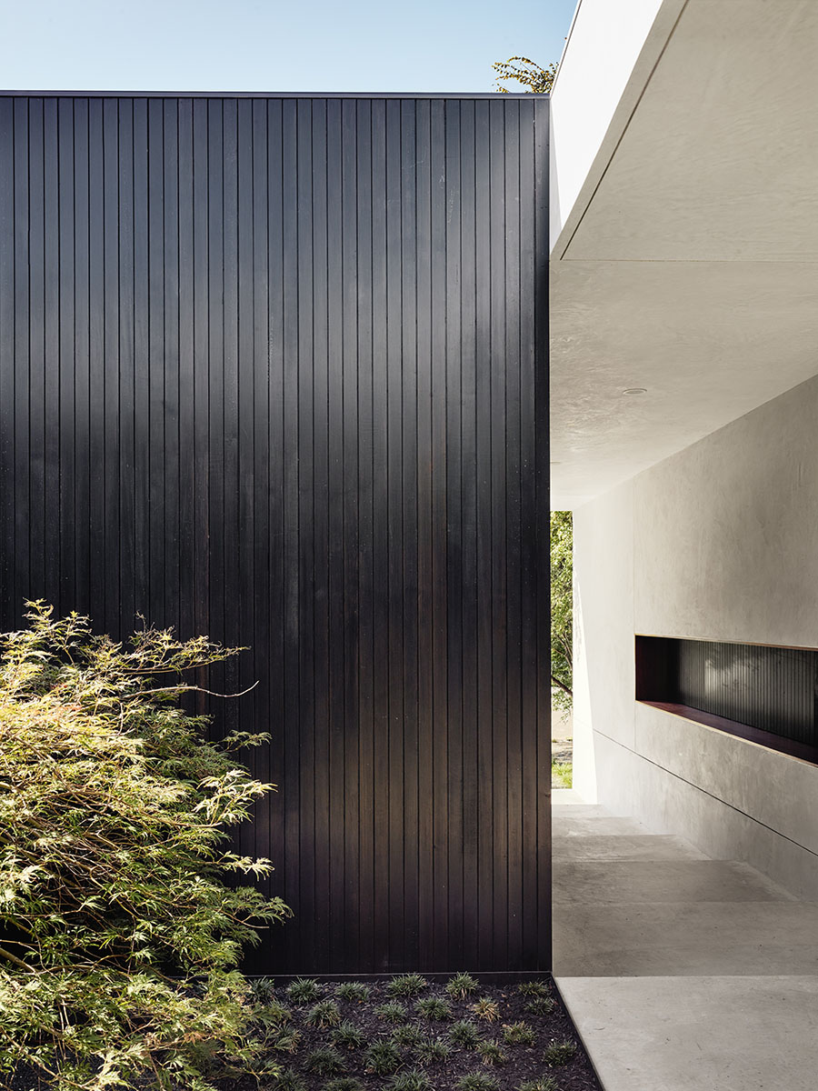 the existing trees and opens to the south. Starting from a minimal façade, visitors arrive through an extended entry sequence that culminates in a landscaped courtyard. Only then are the home’s great room, outdoor living area, and natural panorama revealed.The resulting architecture afford its residents different experiences throughout the house—at places cozy and nest-like, and at others bright and dramatic, open to the view beyond.