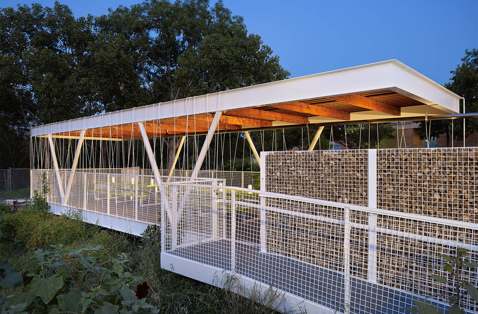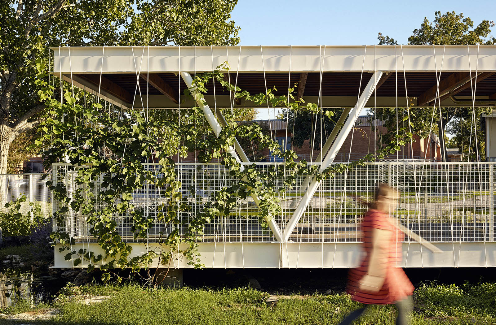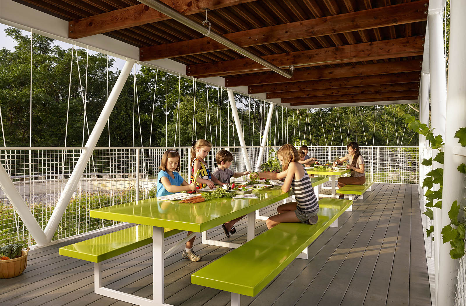 The structure features a vine supporting enclosure made of 3/8” steel dowel, almost as if a child had wrapped the entire project in string. Although playful, the deciduous vegetation also functions to provide shade in hot months and sun in the winter. A rainwater collection system anchors the project, supplying water for the gardens while teaching lessons about environmental stewardship