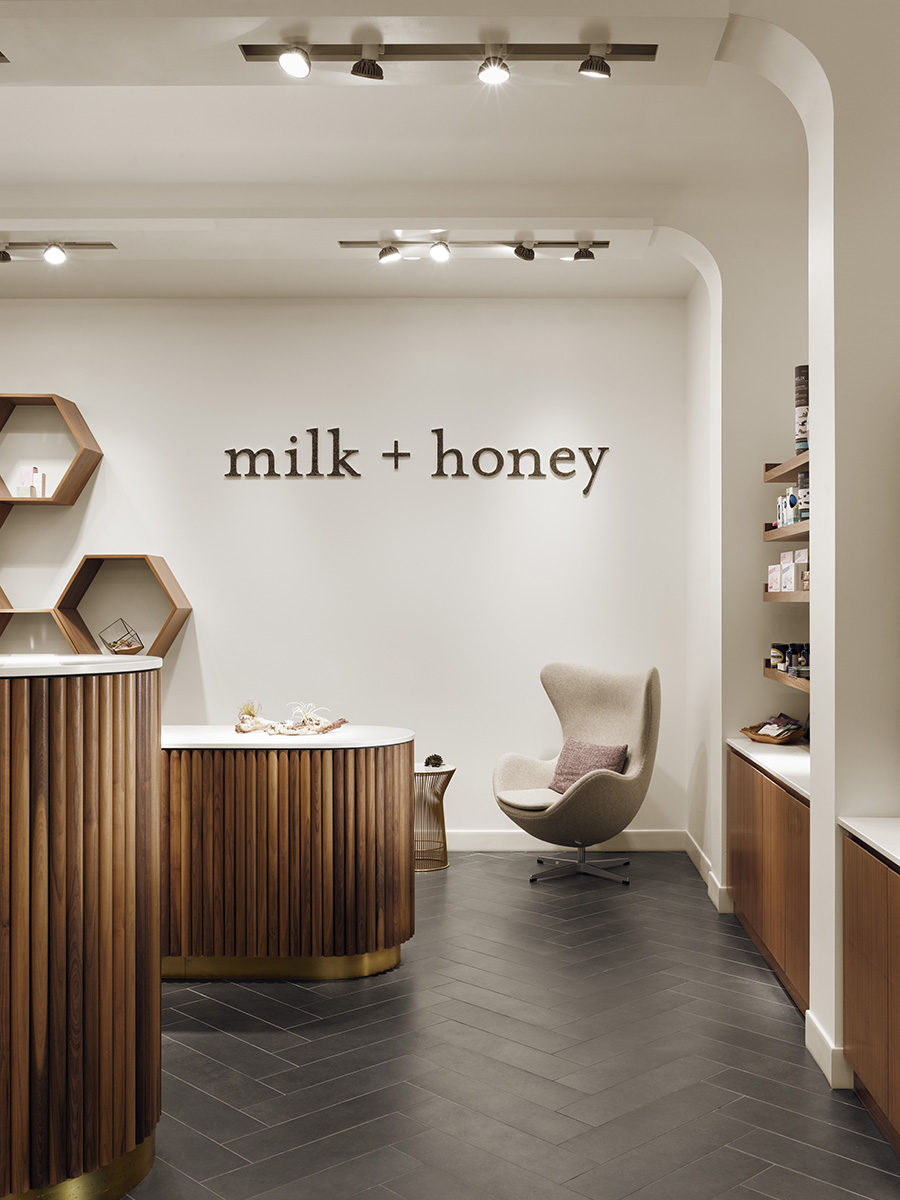 Our second project with our friends at Milk + Honey. While we worked to keep the spa spaces intimate, this former Saks Fifth Avenue shell boasted 45-foot ceilings in some areas and a flamboyant gold-leaf clad monitor with an oculus at its center. Our choice was to embrace it – leaving the gold leaf in place.