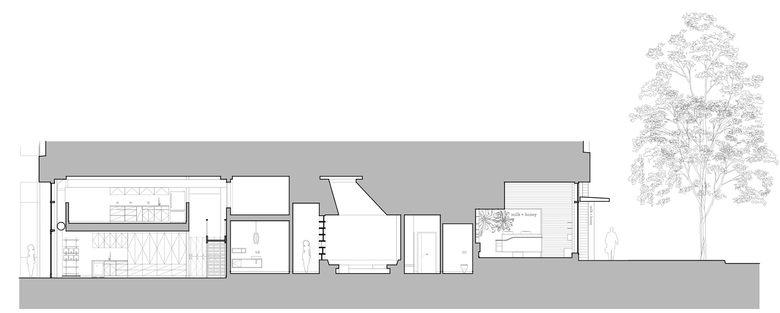 Responding to the challenging grades of site, the interior steps downward creating a series of thresholds that enhance the sense of transition from the urban street to the refuge of the spa.