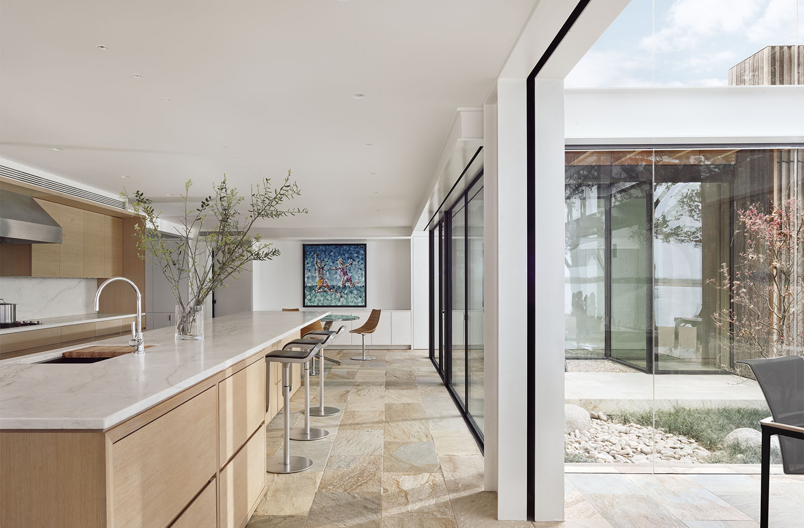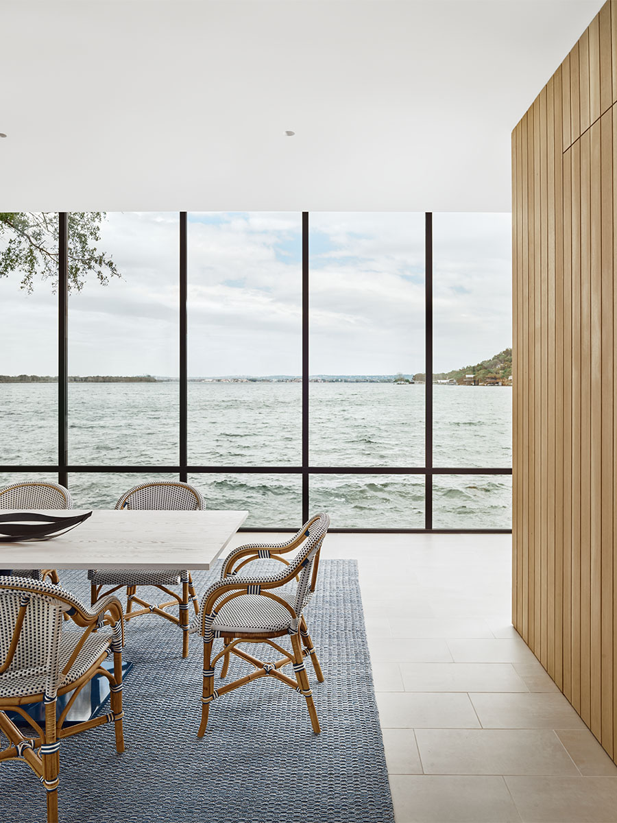 Our core mission involved the creation of a system of interventions that could provide an overall logic to the property. Along with the interior renovation, we worked to create a single eave datum rendered in Douglas fir to essentially cradle the preexisting house, while creating a new primary wing, entry sequence, and boathouse.