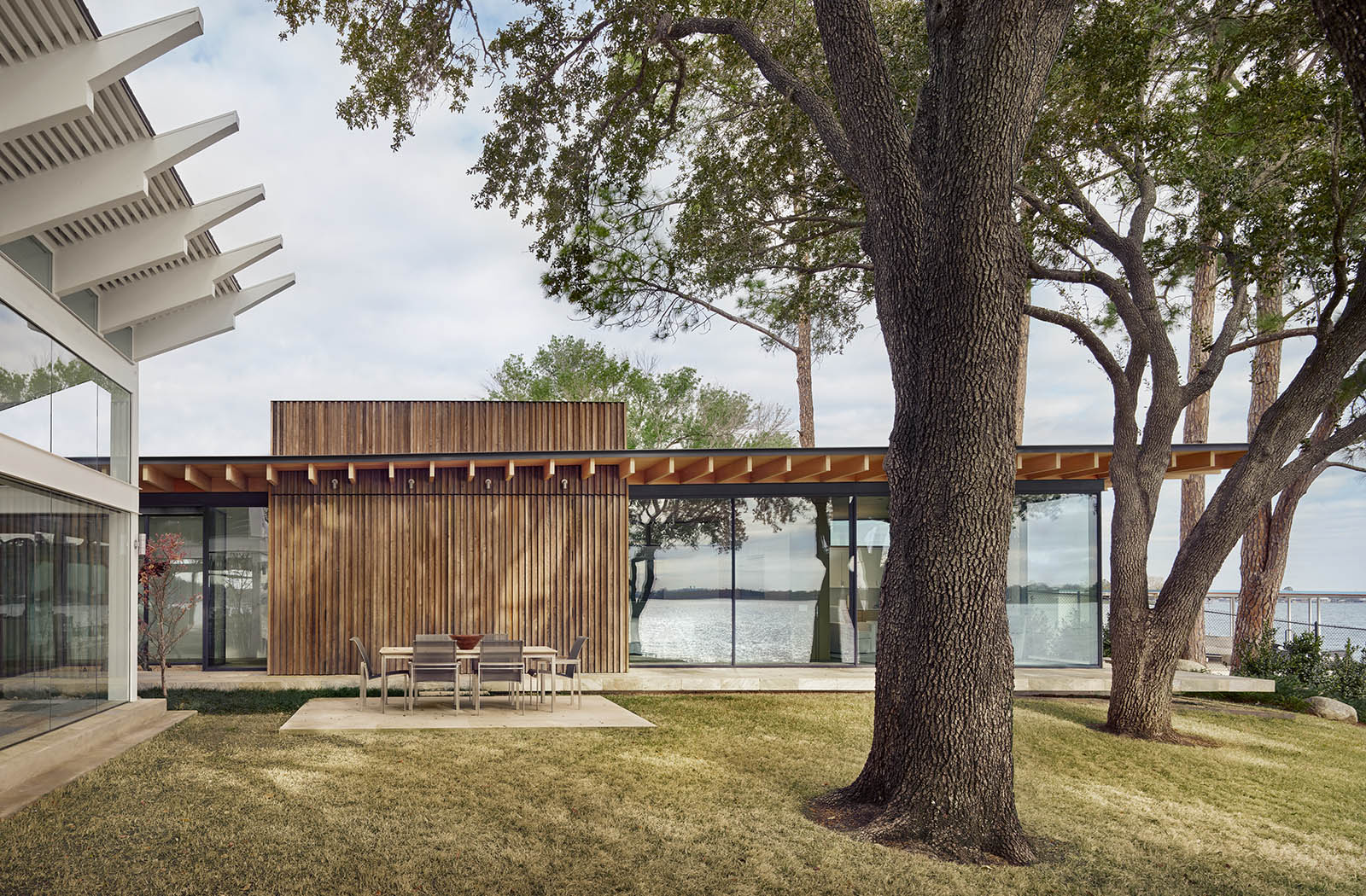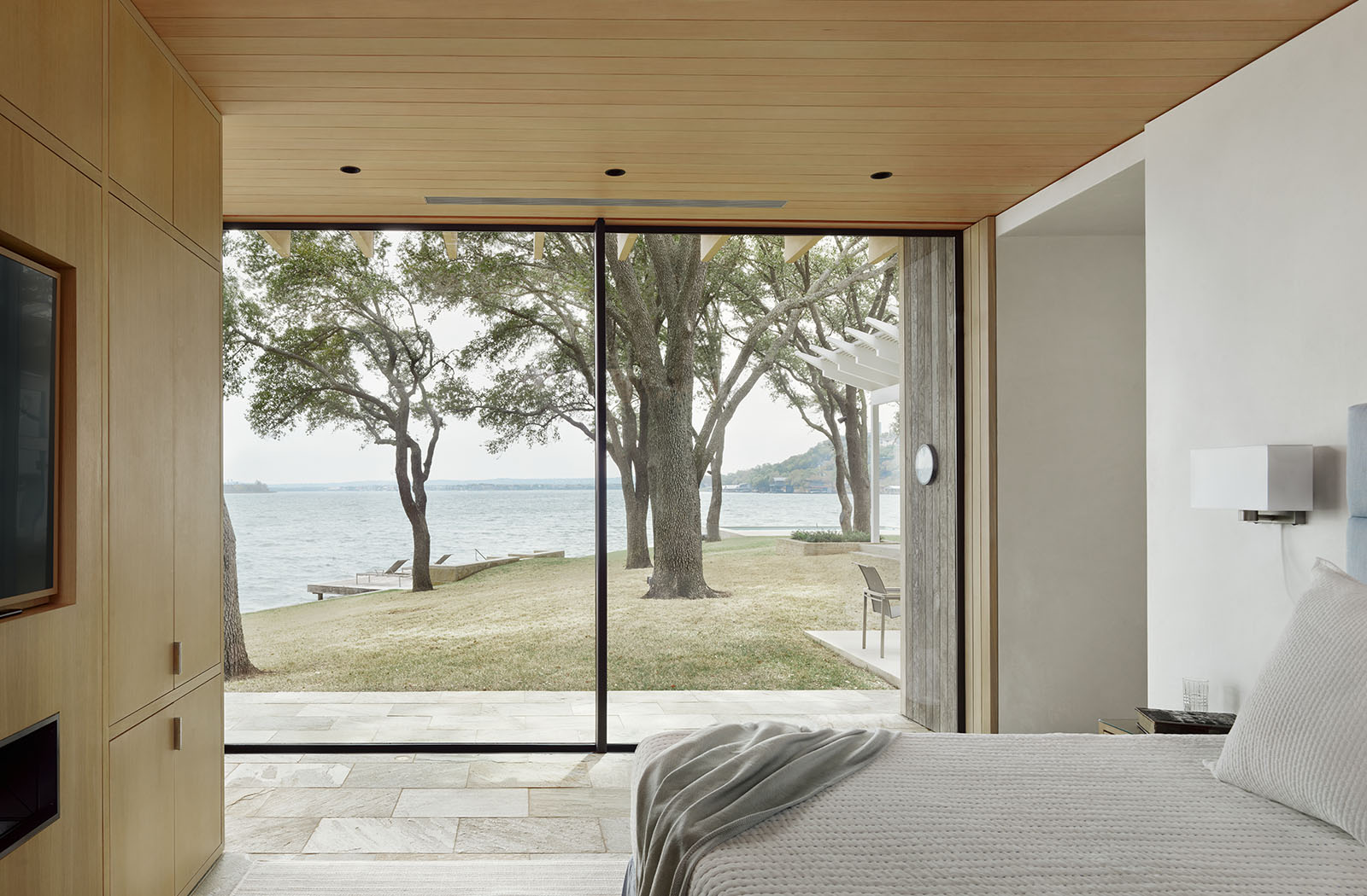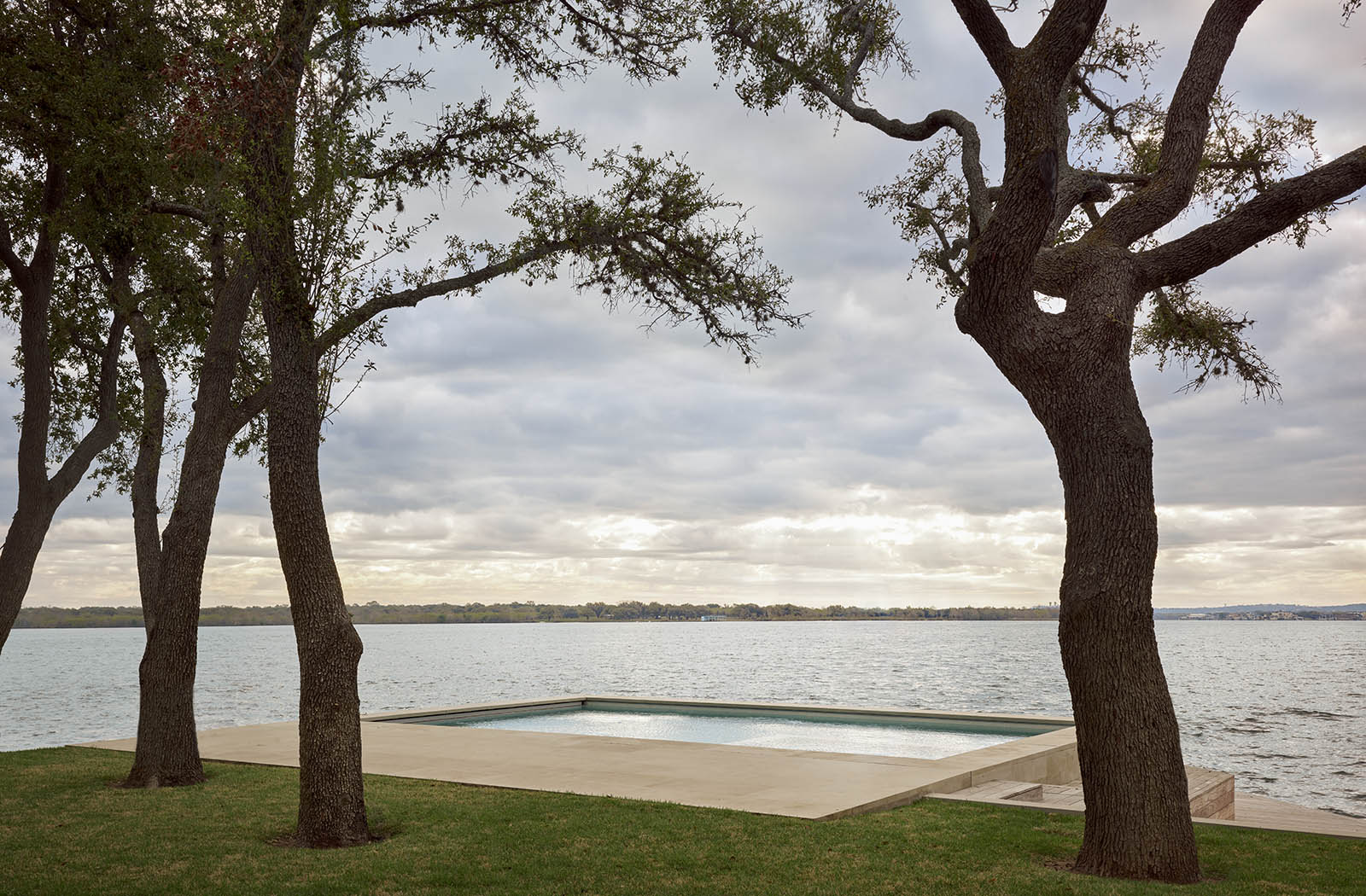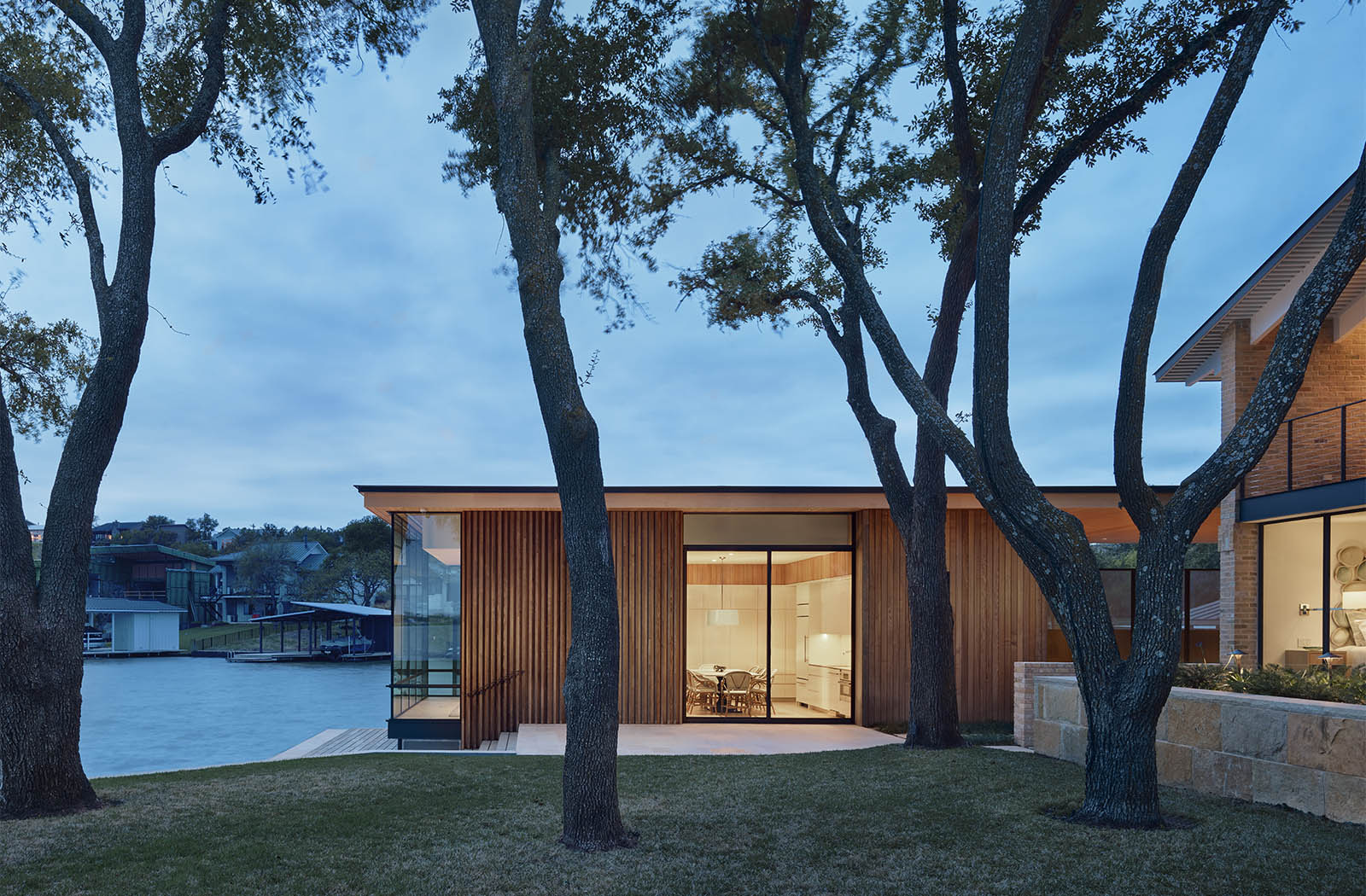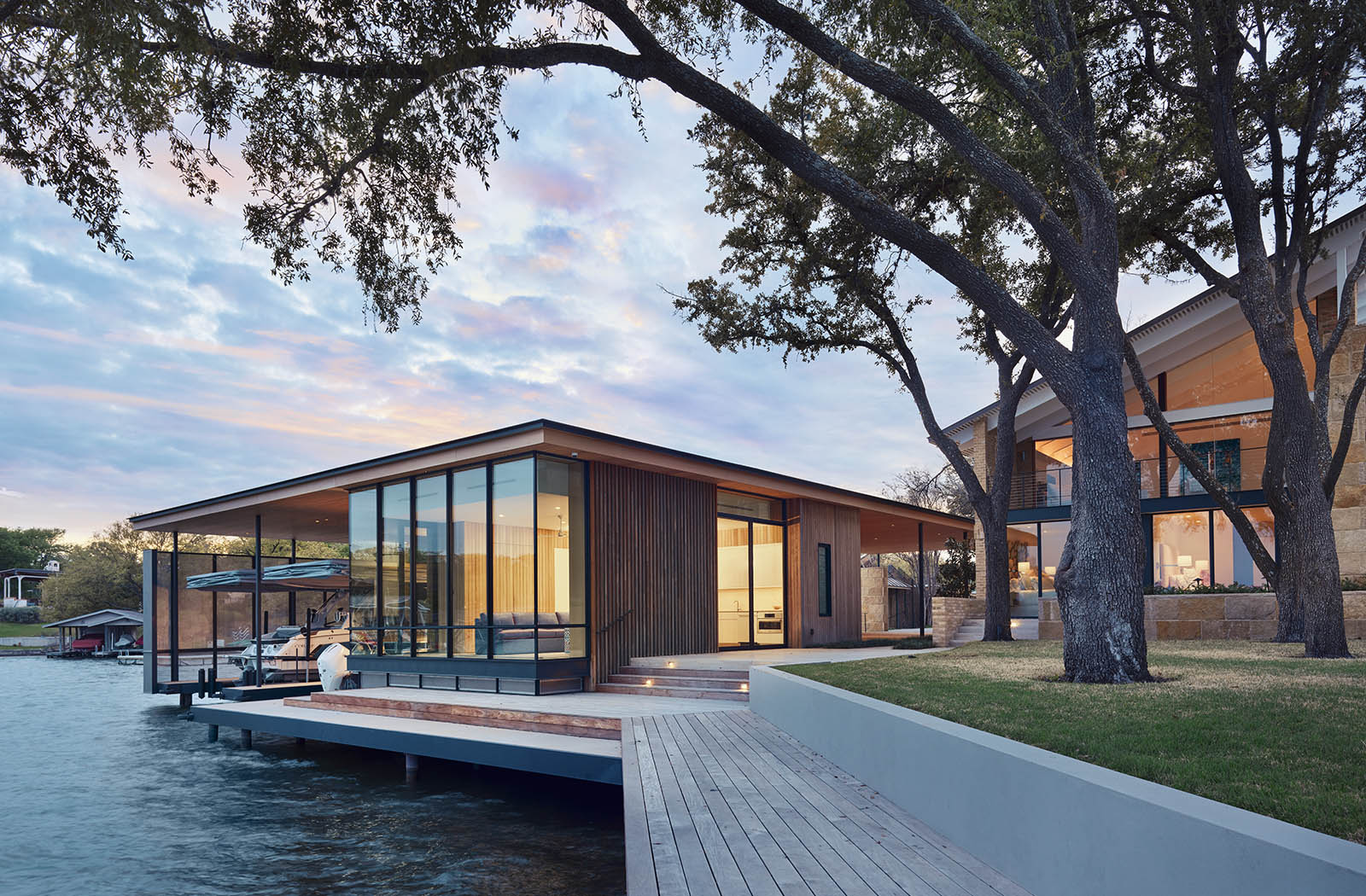 This is a vacation house on Blue Lake in Marble Falls, Texas, for a couple and their extended family. The project scope required the complete interior renovation of a distinctively designed existing property along with various additions including a semidetached boathouse, two bedroom suites, a new entry, a new primary suite, a new swimming pool, an elevator, and copious parking for occupants spanning three generations.