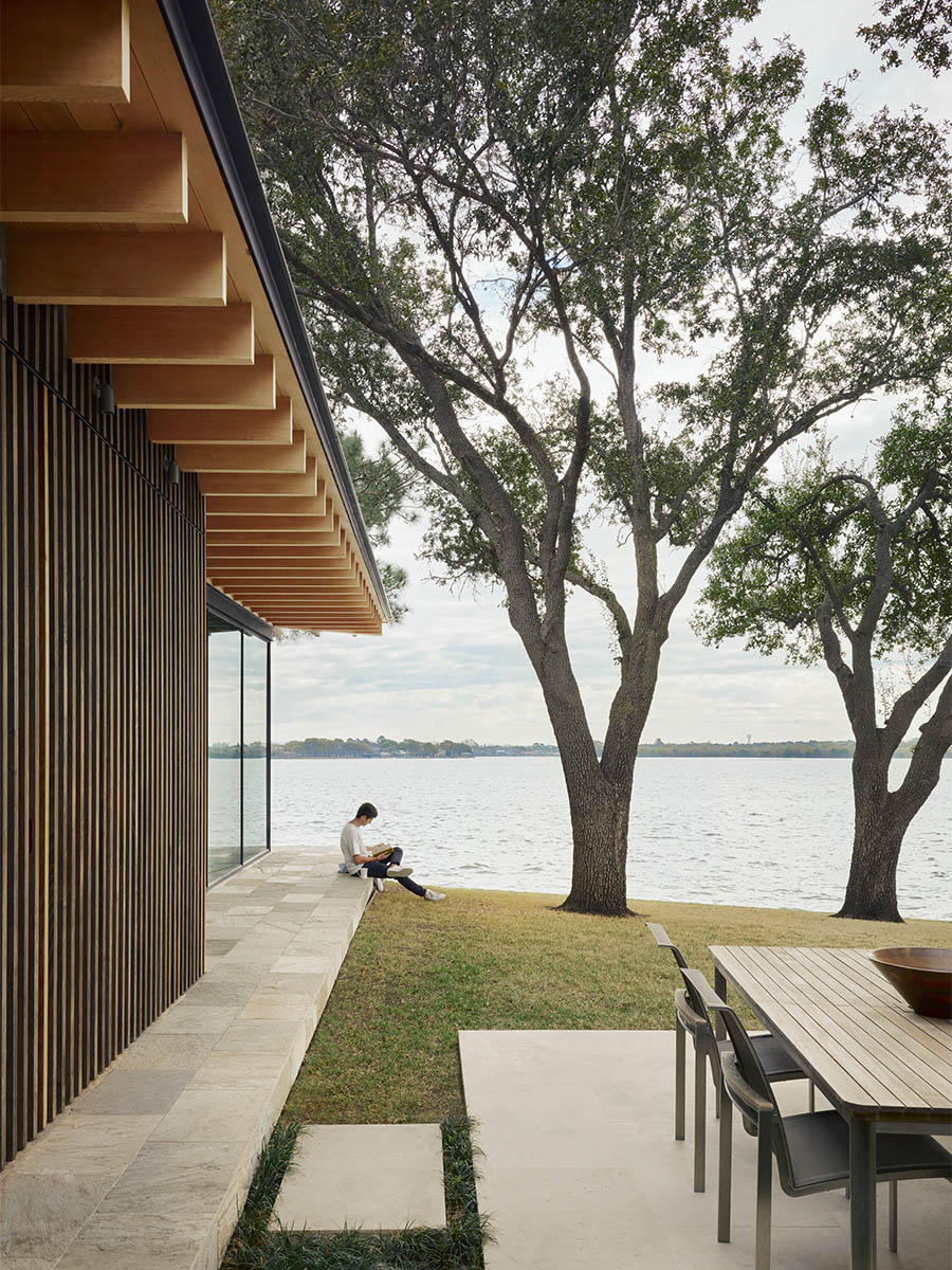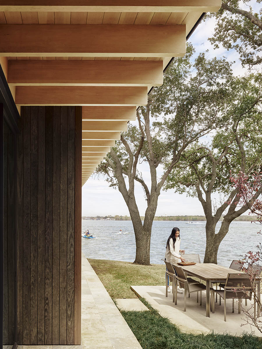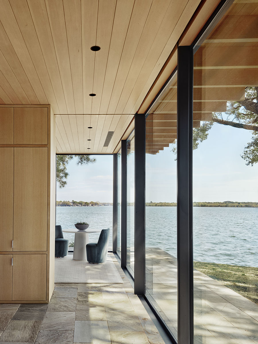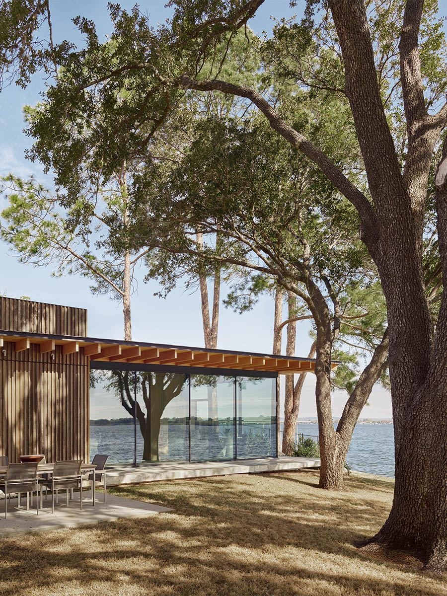 This is a vacation house on Blue Lake in Marble Falls, Texas, for a couple and their extended family. The project scope required the complete interior renovation of a distinctively designed existing property along with various additions including a semidetached boathouse, two bedroom suites, a new entry, a new primary suite, a new swimming pool, an elevator, and copious parking for occupants spanning three generations.