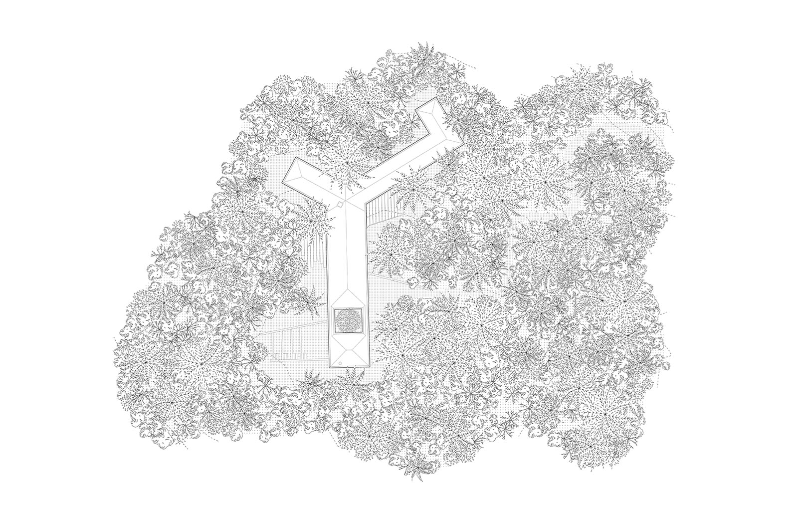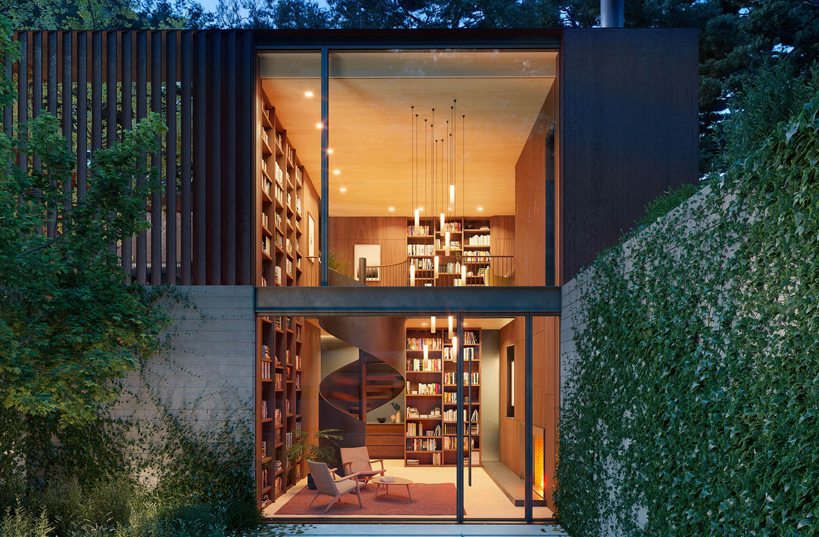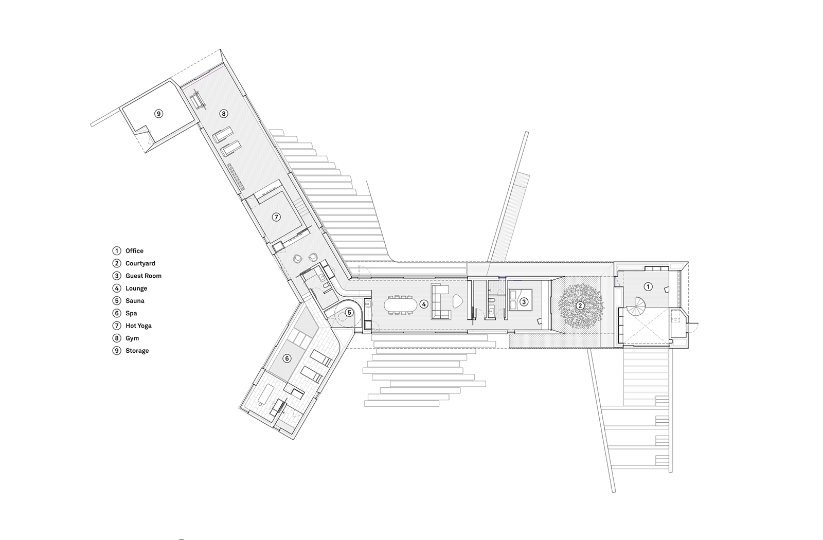 Equal parts spa, gym, apartment, office, and sunken library, the three-spoked design responds to the trees at the property.