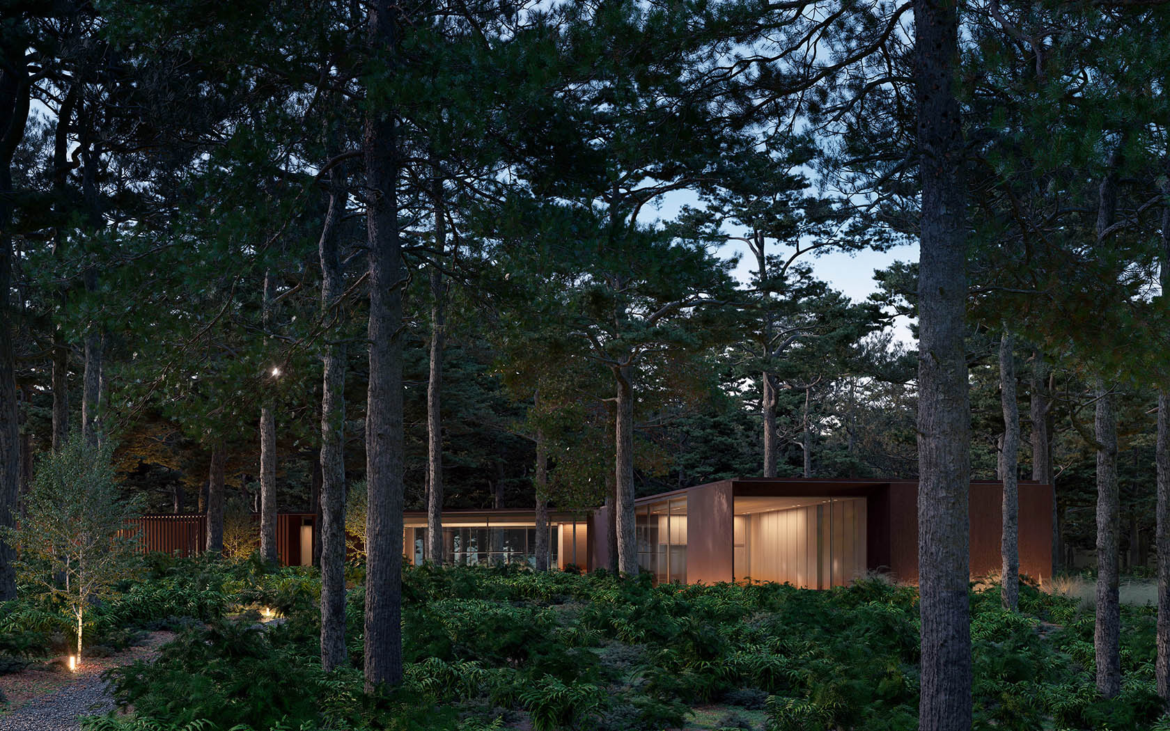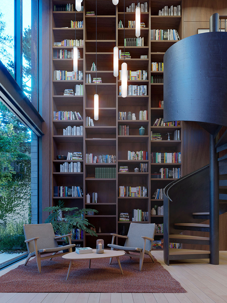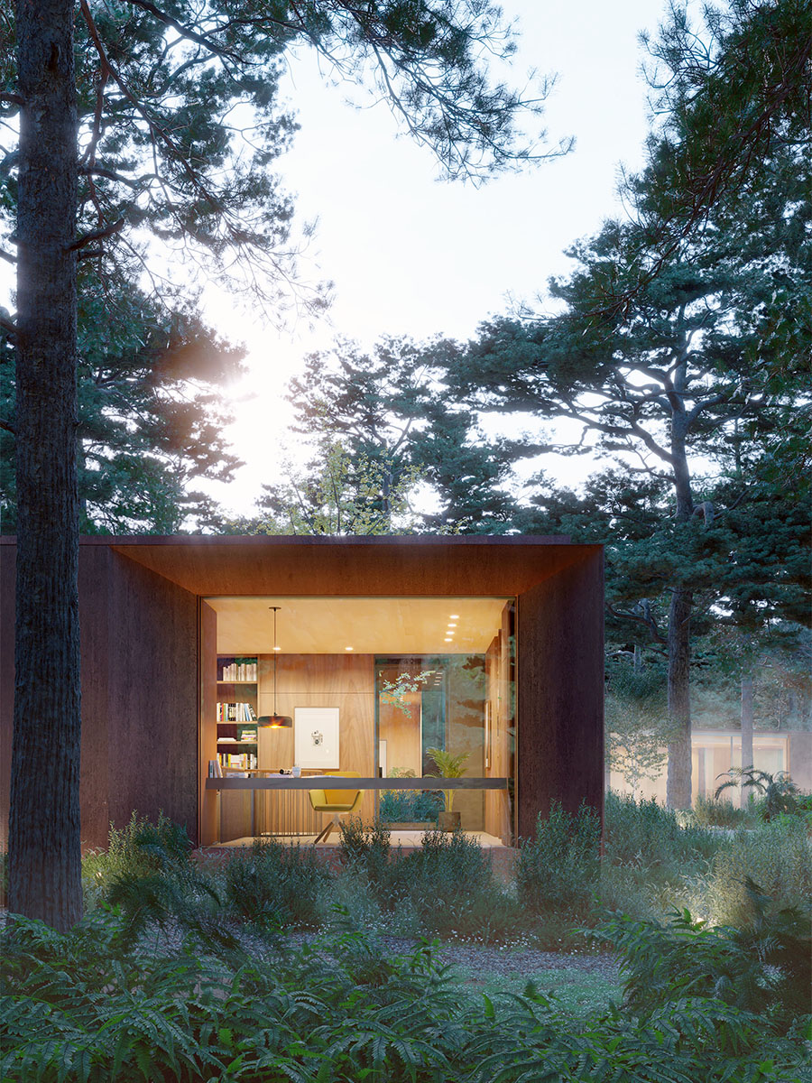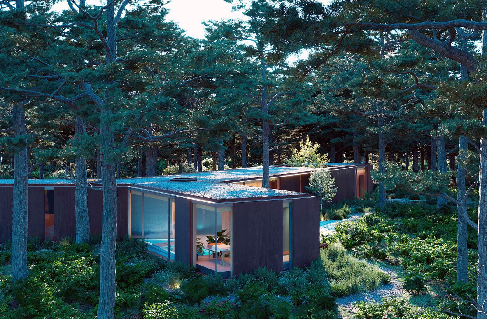 Equal parts spa, gym, apartment, office, and sunken library, the three-spoked design responds to the trees at the property.