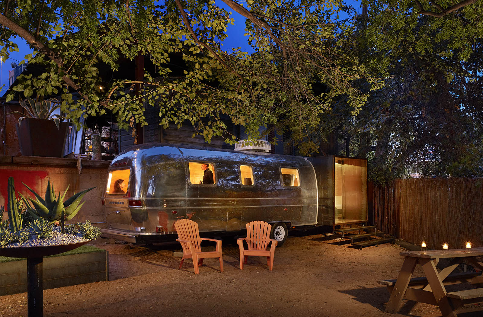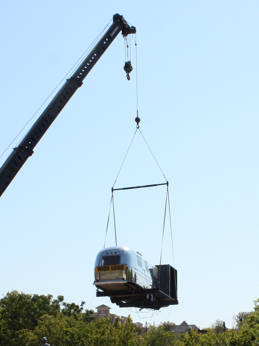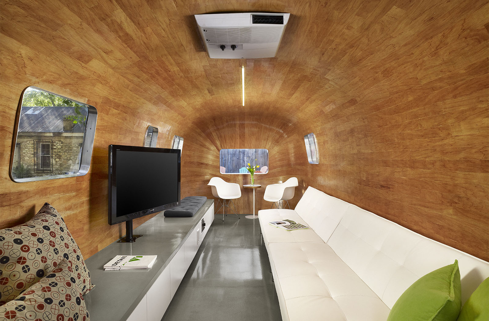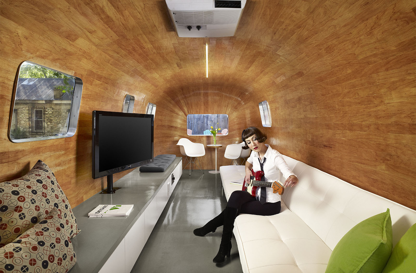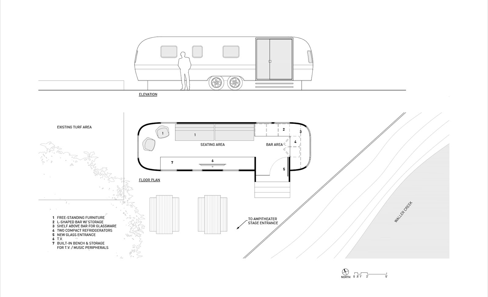 Stubbs Barbeque and Waller Creek Amphitheater (located in downtown Austin, Texas) engaged us to assist in improving its amenities in an inaccessible triangle along Waterloo Greenway (previously Waller Creek). The crux of the design problem was that the improvements would reside in a floodplain – whatever we installed needed to be moveable. The solutions was the fit-out of a disused 1970s Airstream trailer, transforming it into a “greenroom” for artists playing at the venue.