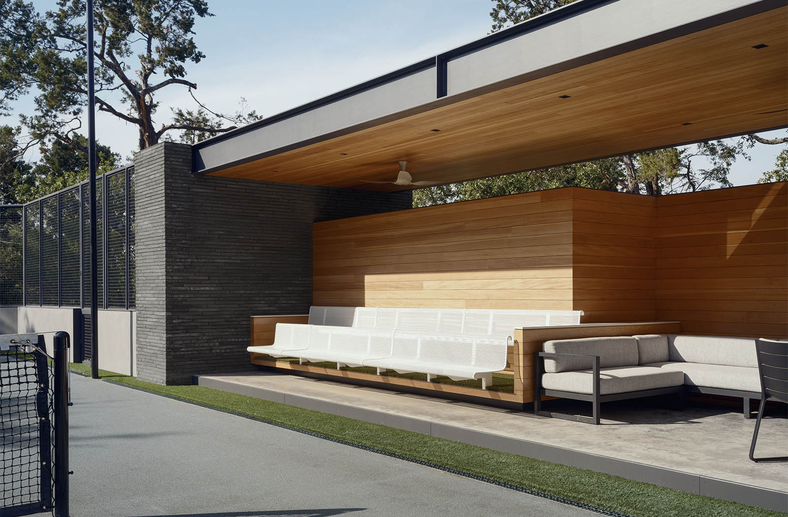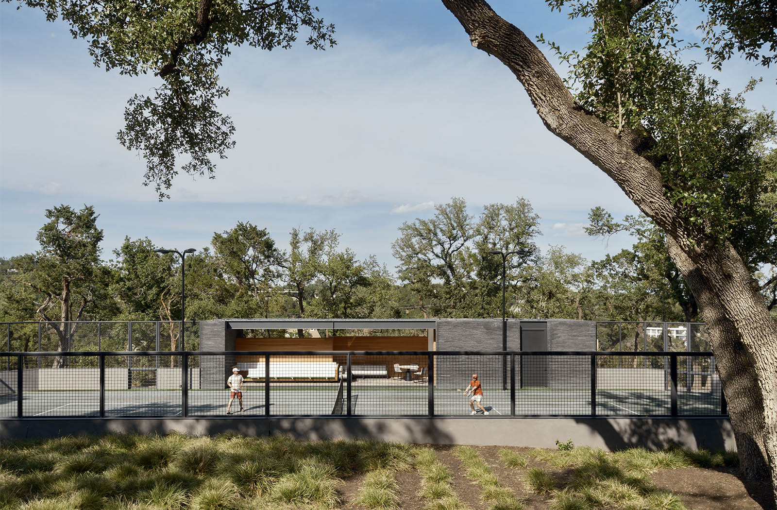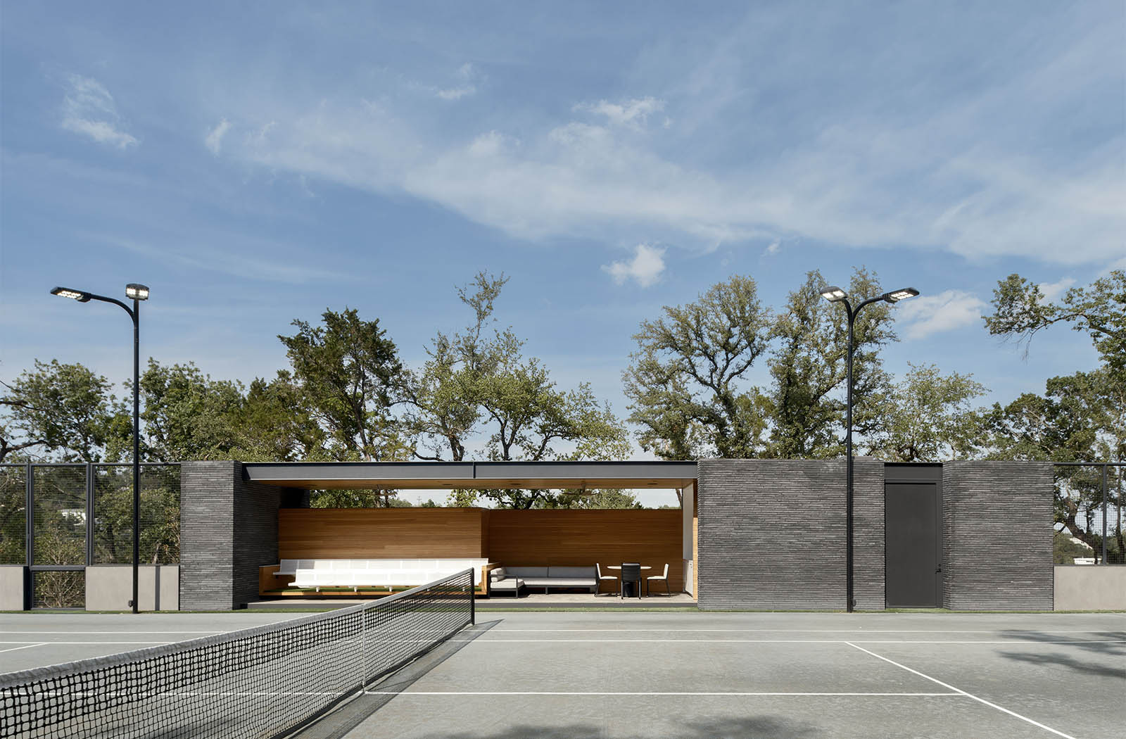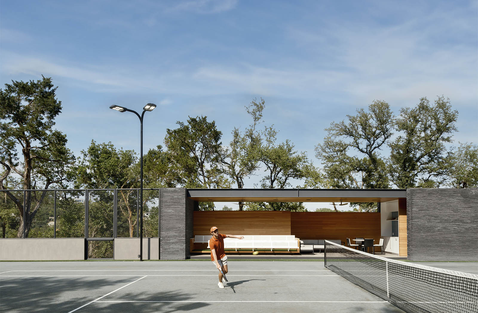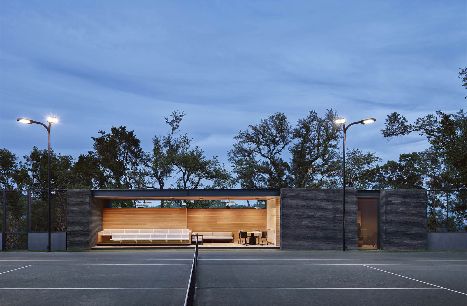 Most tennis pavilion precedents we found were precious. Taking cues from the mid-century modern rest-stops along our Texas highways, we chose to go another direction – to make this precise, but raw and elemental. The unconditioned project incorporates custom bleachers, kitchenette, changing room and bathroom, storage, and of course, a clay court. We worked with natural hand-made brick, Douglas fir, and painted steel to create a comfortable, durable, and striking place for playing and viewing.