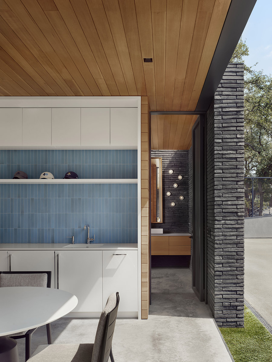 Most tennis pavilion precedents we found were precious. Taking cues from the mid-century modern rest-stops along our Texas highways, we chose to go another direction – to make this precise, but raw and elemental. The unconditioned project incorporates custom bleachers, kitchenette, changing room and bathroom, storage, and of course, a clay court. We worked with natural hand-made brick, Douglas fir, and painted steel to create a comfortable, durable, and striking place for playing and viewing.